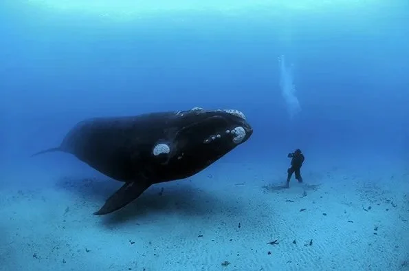 Off the Auckland Islands, a southern Right Whale moves in for a closer look at Skerry’s diving partner. In 2006, National Geographic photojournalist Brian Skerry began photographing the critically endangered North Atlantic right whale, aiming to raise awareness. He highlighted differences between U.S. East Coast whales, affected by entanglement and ship strikes, and healthier Southern right whales in New Zealand. Photo Credit Brian Skerry National Museum of National History