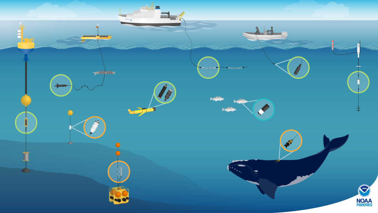 NOAA Fisheries and our partners study marine animals by using a variety of technologies to record underwater sounds, including archival passive acoustic recordings (orange circles), real-time acoustic data collection (green circles), and active acoustics (blue circles).