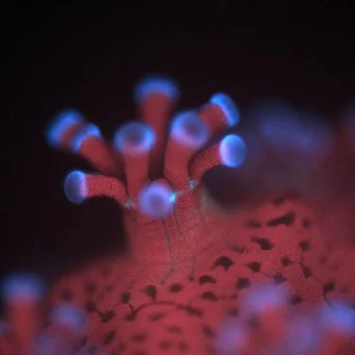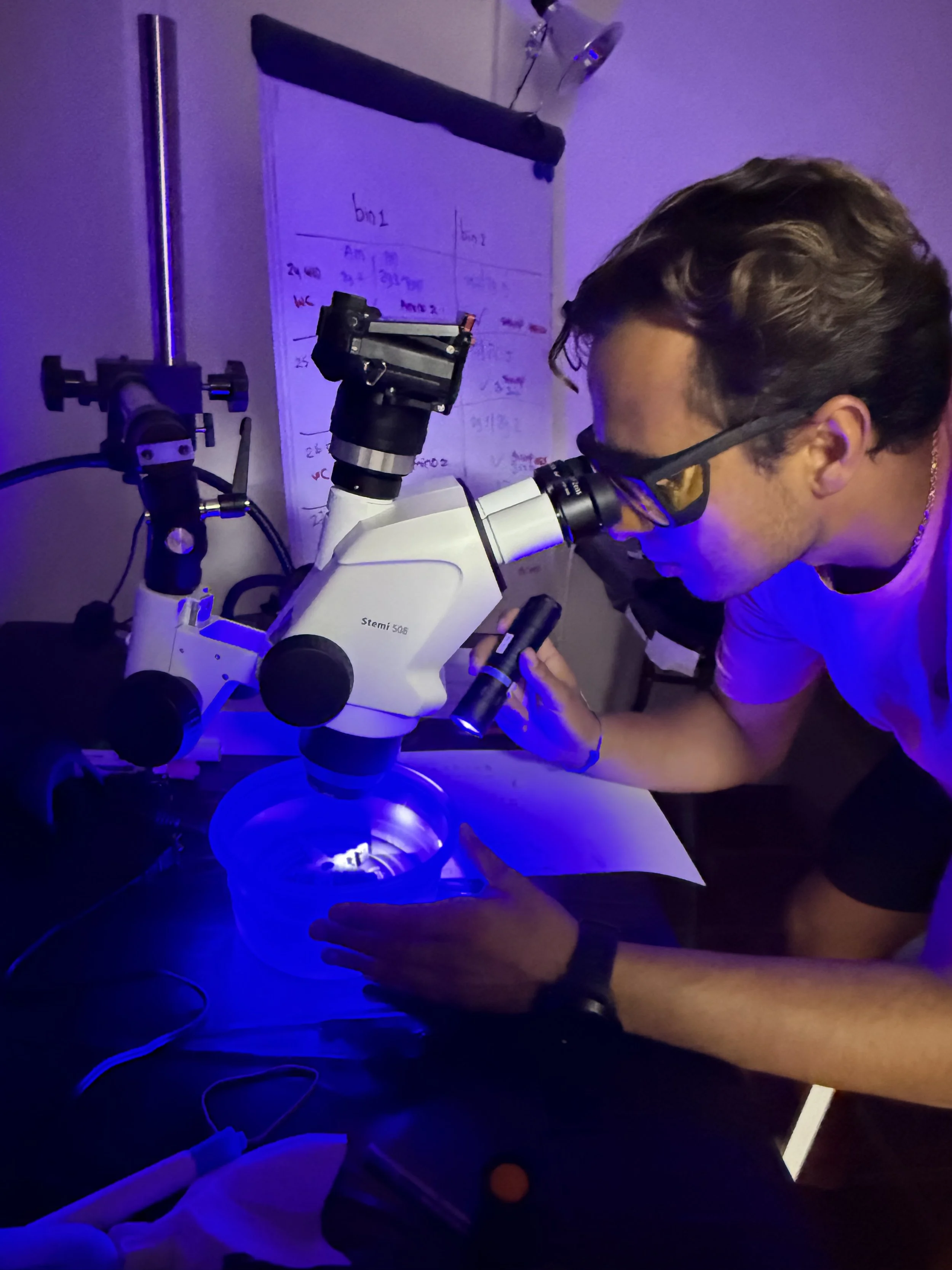 This collaboration enables RRFB to collect coral eggs and sperm, fertilize them in a laboratory setting, rear the larvae, and then outplant them to the reef, thereby increasing the genetic diversity and resilience of the coral population. Everyone was excited about the successful spawning of brain coral gametes. We were fortunate to visit the Reef Renewal laboratory, where, with the help of ultraviolet light and yellow filters, we could see new coral polyps settling into the nooks and crannies of the ceramic star. These polyps fluoresced red and were about 1-2mm, or about 1/32 of an inch, in diameter; the doughnut shape was barely visible to the naked eye. Jason Mirsopoulos, Coral Restoration Practitioner & Bioinformatics Specialist, explained that volunteers on the reef renewal team collected the gametes of a brain coral earlier in the month. They were not successful in the last two years. He believed that the corals may have been too stressed out to spawn due to the marine heatwave, which hit the reef later in the summer and fall of 2023 and persisted through 2024.