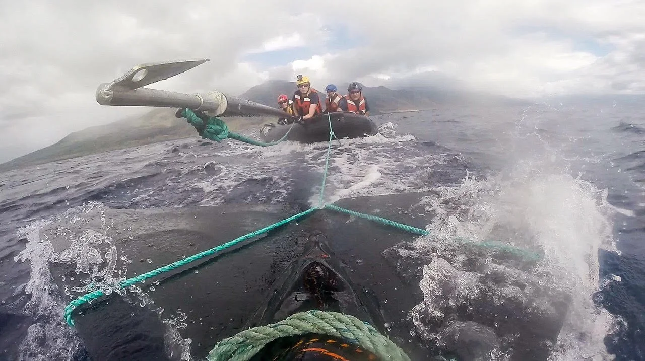 We also use hooked knives mounted on long poles, allowing us to cut lines while keeping a safe distance from the animal. Some rescues take multiple attempts over days or weeks, and we may attach satellite transmitters to track the whale if it moves out of sight.